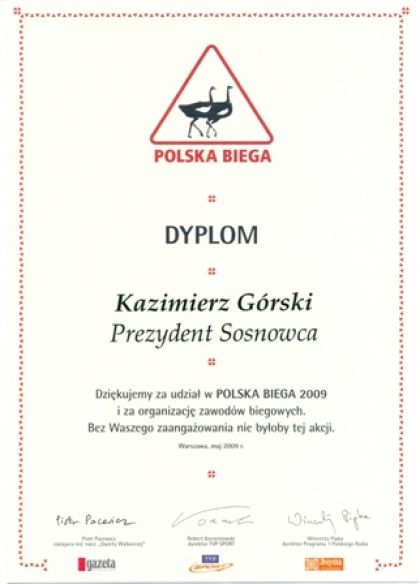 Na ręce Prezydenta Miasta Sosnowca Kazimierza Górskiego przekazano podziękowanie za udział w akcji Polska Biega 2009. Biegi organizowane w ramach akcji odbyły się w dniach 9-10 maja.
